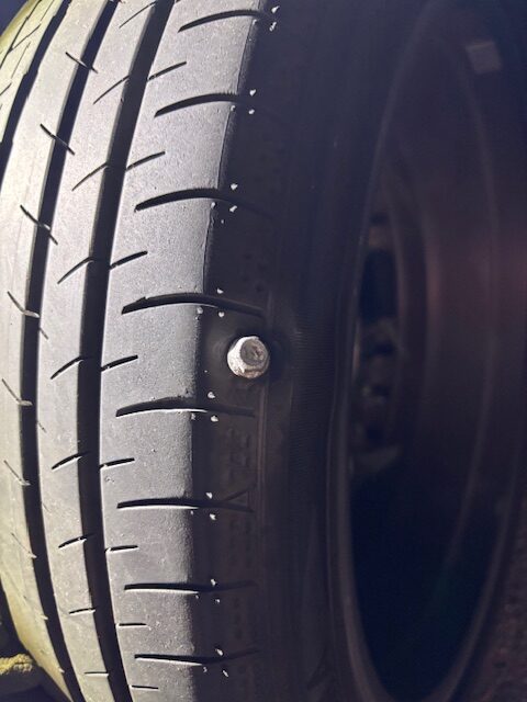 豊明市や刈谷市は特に、工場も多いし幹線道路もあるので道路上にボルトやネジがよく落ちてますからね!気を付けましょう!とアドバイスをいただきました。「ただ、今回の刺さり方はとても珍しいです。かなりの確率です!」「宝くじを買ったらきっと当選する確率です!」と慰めてももらいました。